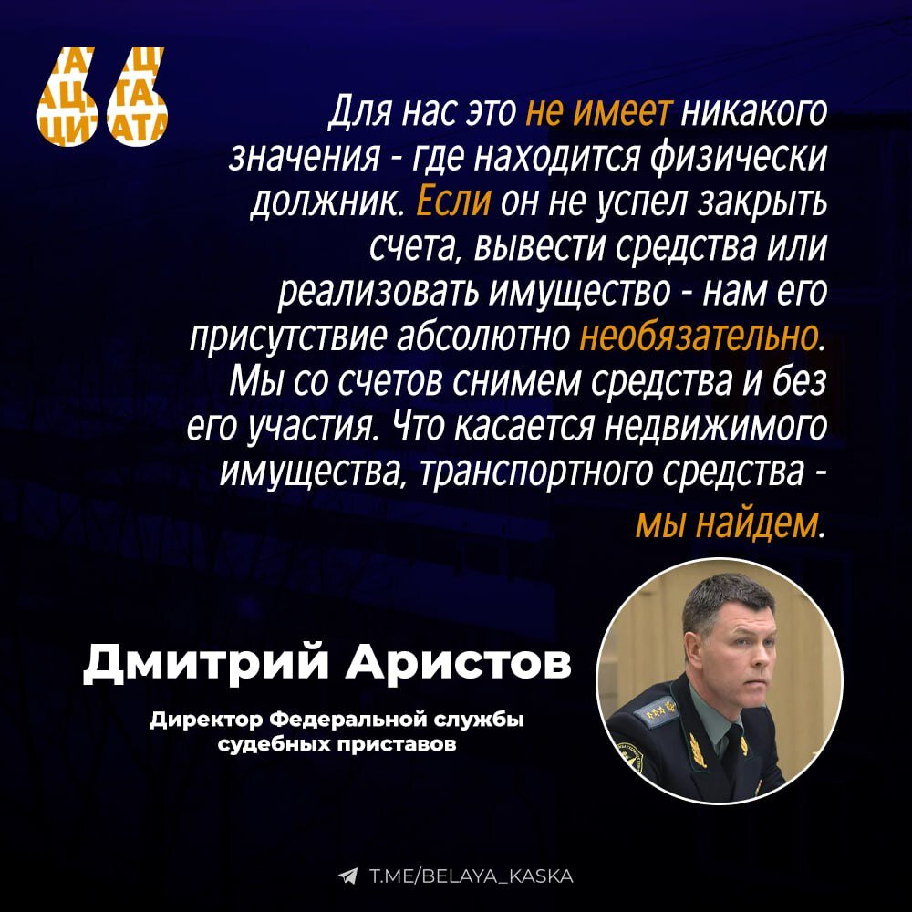 Имущество уехавших должников будет продано, а счета арестованы. Директор ФССП Дмитрий Аристов заявил, что судебные приставы имеют возможность взыскивать долги с россиян, которые уехали из страны, вне зависимости от их местонахождения. •По его словам, в случае неуплаты штрафов приставы будут осуществлять арест и продажу имущества должника, а штрафы будут взысканы. Также он подчеркнул, что для ареста и реализации движимого имущества не требуется участие должника, и в случае нахождения имущества на территории, оно будет арестовано и продано.