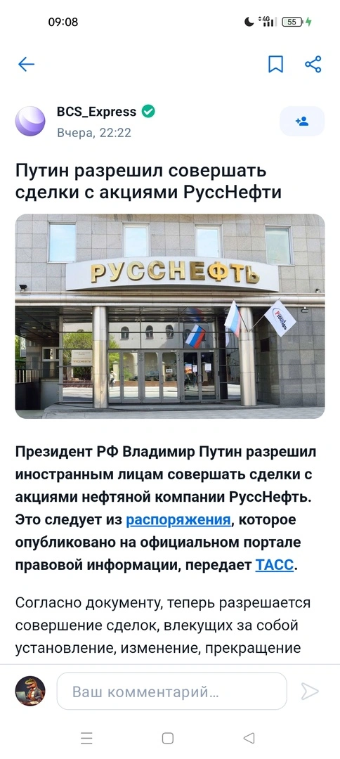 ΠΡΠ΅ΡΠ° Π²ΡΡΠ»Π° Π½ΠΎΠ²ΠΎΡΡΡ ΠΎ ΡΠΎΠΌ, ΡΡΠΎ ΡΠΎΡΡΠΈΠΉΡΠΊΠΈΠΉ Π½Π΅ΡΡΡΠ½ΠΎΠΉ ΡΠ΅ΠΊΡΠΎΡ Π±ΠΈΡΠΆΠΈ Π±ΡΠ΄Π΅Ρ Π΄ΠΎΡΡΡΠΏΠ΅Π½ Π·Π°ΡΡΠ±Π΅ΠΆΠ½ΡΠΌ ΠΈΠ½Π²Π΅ΡΡΠΎΡΠ°ΠΌ. ΠΠ° ΡΠ°ΠΌΠΎΠΌ Π΄Π΅Π»Π΅ ΡΡΠΎ ΠΎΡΠ΅Π½Ρ ΠΈ ΠΎΡΠ΅Π½Ρ ΠΏΠΎΠ»ΠΎΠΆΠΈΡΠ΅Π»ΡΠ½Π°Ρ Π½ΠΎΠ²ΠΎΡΡΡ!!!