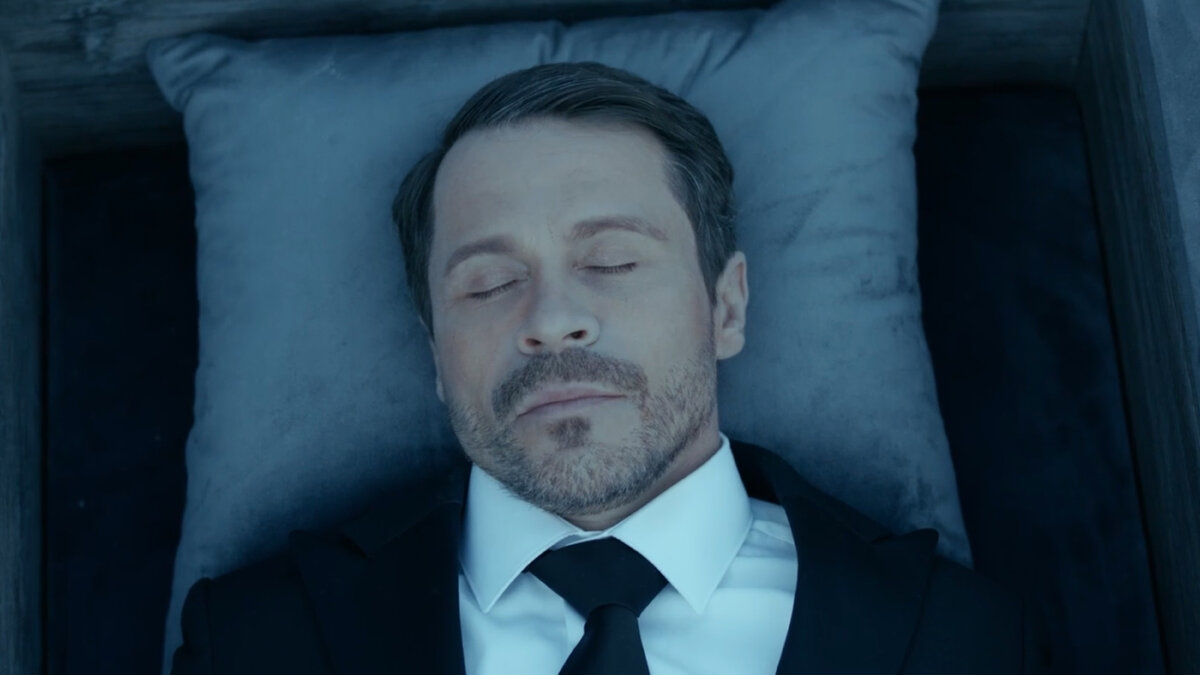 Пребывание Славы в гробу представляет собой парафраз камерного (а точнее, гробового) артхаусного триллера «Погребенный заживо» 2010 года, где Райан Рейнольдс проводил полтора часа в деревянном ящике наедине с «зиппо» и неумолимо разряжающимся мобильным телефоном. Слава, само собой, к закладыванию в гроб подготовился гораздо более тщательно и обмозговал все до мелочей, включая положенную покойнику по актерской традиции бутылку водки и памперсы для взрослых (как решал проблему отправления естественных надобностей герой Рейнольдса, кстати, до сих пор непонятно). Но главное, что у Славы над головой светится специально вмонтированное в крышку гроба звездное небо, чтобы не страшно было под землей. Когда герой периодически начинает все-таки паниковать и колотиться, небо то угрожающе гаснет, то снова загорается с надеждой.