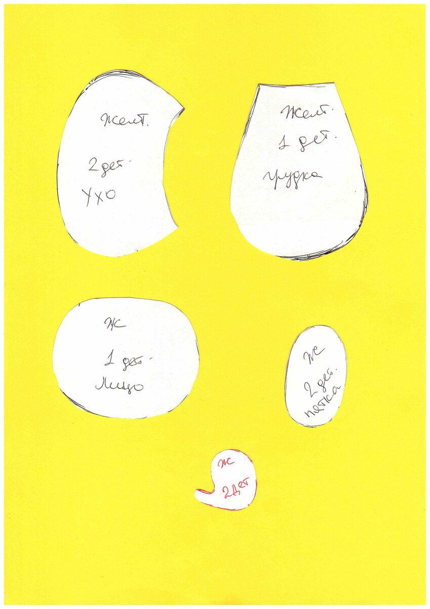 Не человек, и не зверушка Просто мягкая игрушка Начинается на «Ч» Очень люб он детворе. (чебурашка) Сегодня я хочу предложить вам сшить эту милую игрушку из вискозной салфетки по упрощенному варианту. 1. Для пошива чебурашки я буду использовать оранжевую тряпку для пола и желтую салфетку. 2. Это выкройки самой игрушки. 3. Основные детали игрушки я предлагаю кроить из оранжевой тряпки для пола. Тряпку складываем вдвое, раскладываем выкройки, обвожу гелевой ручкой. Не забываем продублировать ногу, руку и ухо. 4. Бумажные выкройки убираю. Детали скалываю булавками, чтобы удобнее было вырезать, а салфетка не сдвигалась. 5. Вырезаем. 6. Из желтой салфетки выкраиваю отделочные детали: лицо и грудка - по 1 детали, ступни и ладошки – по 2 детали. Выкройки также обвожу гелевой ручкой. 7. Вырезаю 8. Желтые детали примеряем на оранжевые детали. 9. Приклеиваем с помощью клея «Титан». 10. Когда все детали готовы, можно переходить к их сшиванию. Сшиваю детали рук и ног. Шьем петельным швом вручную и
