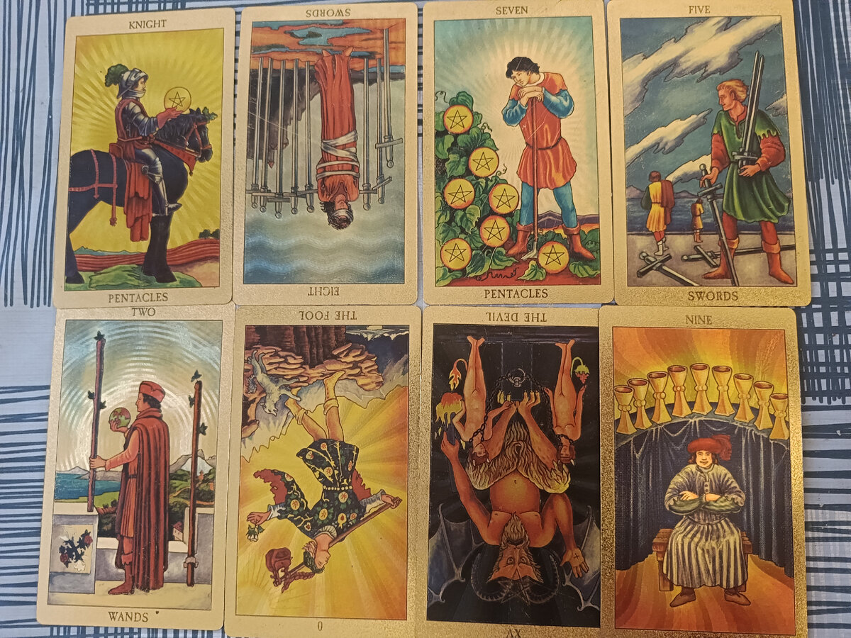 Срочно хочет передать Вам весточку Ваш бывший. Настолько срочно, что у меня выпрыгивали из рук карты и скакали по всей кухне. Я их ловила под столом и никак не могла сошкрябать своими ногтями с пола. Итак, что ж он так спешит передать? Девочки, Ваш бывший спешит срочно передать ЧТО ОН МЕДЛЕННО К ВАМ НАВОСТРИЛСЯ :)))). Стоит на правильном пути. У кого-то лежит в правильном направлении к Вам. Вы, кстати знаете за ним, что он тормозок. Доходит до него ооччееень медленно. Это когда парень решился и позвонил, а Вы уже замуж второй раз вышли и четвертого ребенка ждете. Это капец, не парень, а анекдот. Итак, по Рыцарю Пентаклей он наконец решился к Вам проявиться, но думает теперь - как ему обойти Ваши блокировки и Ваши тупики в отношениях - Рыцарь Пентаклей и 8 мечей Перевернутая. Он считает, что очень много вложил в Ваши отношения и хочет наконец получить от них свой профит. Вроде как закопать топор войны, но при этом и поживиться. Дескать, много он вложил, а воспользоваться результатом