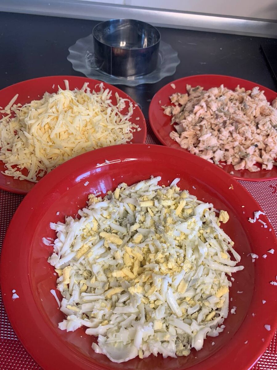 Привет, друзья! Оказалось, что добавка в виде авокадо очень даже преображает обычную Мимозу. Ну а если горбушу использовать не из банки, а сваренную собственноручно, то это будет бомба! Вот такие продукты нам понадобятся. Салат будем делать в порционных формочках. Первым слоем пойдет сыр тертый на крупной терке и смешанный с майонезом. Дальше слой варенной горбуши, тоже смазанной майонезом. Последним слоем выкладываем тертые на крупной терке яйца, соль, майонез Ну и наконец, дошла очередь до авокадо. Нарезаем его ломтиками и укладываем веером поверх всех слоев, а серединку украшаем розочкой из соленой семги. Готовьте и наслаждайтесь, это очень вкусно!
