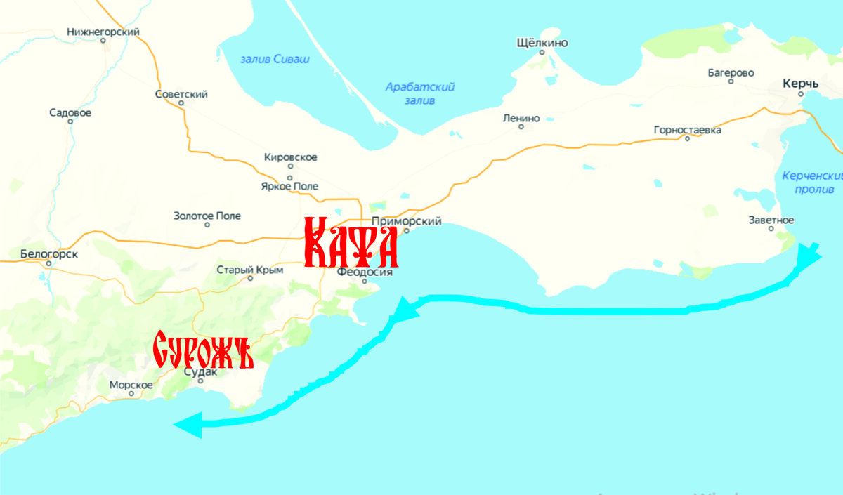 Кафинскій лименъ - это Феодосийский залив, а Сурожъ, Судак.