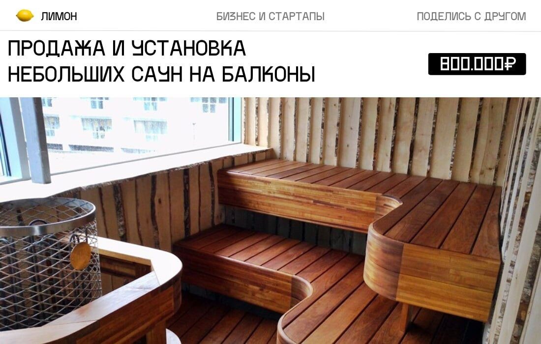 Бизнес Идея: Продажа и установка небольших саун на балконы Стартовый капитал: от 800.000₽ Элегантные мини-сауны, размещенные на балконах квартир, становятся всё более популярными среди городских жителей. Установка такой конструкции позволяет значительно сэкономить время и средства на посещение спа-салонов или тренажерных залов. Процесс работы с клиентом начинается с приема заявки, после чего вы отправляетесь по указанному адресу для проведения необходимых замеров. Затем вы заказываете требуемые материалы, при этом доверяя создание стальной конструкции опытной рабочей группе. Лимон 🍋 | Подписаться