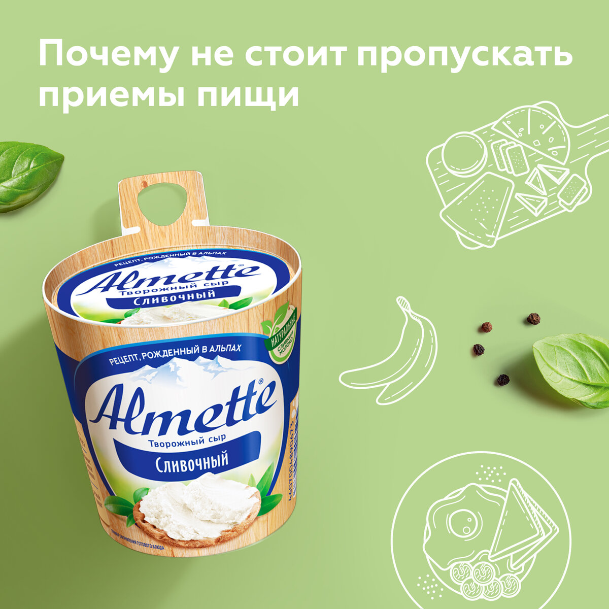 Предлагаем каждый приём пищи планировать заранее и делать их такими, чтобы они вам нравились. Как? Выбирать любимую еду. Например, Almette можно добавлять в омлет, авокадо-тост и даже салат. Когда еда нравится, вам точно не захочется её пропускать. Кто же откажется от удовольствия?