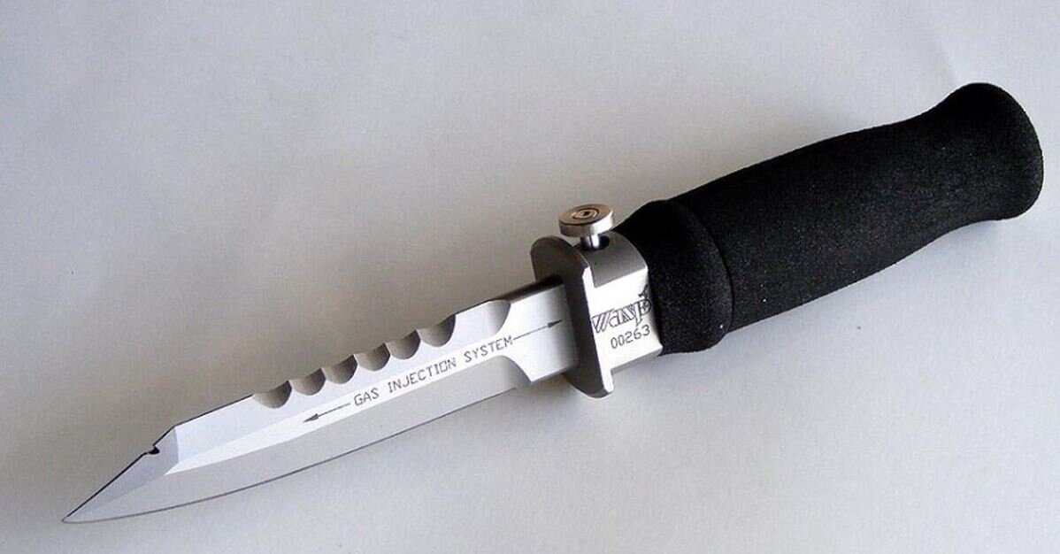 Длина боевой части ножа чуть более тринадцати сантиметров, а вес с баллоном внутри – 383 г. Патент на этот образец, оснащённый системой газового впрыска, зарегистрирован в Соединенных Штатах. После того, как клинок оказывается в те