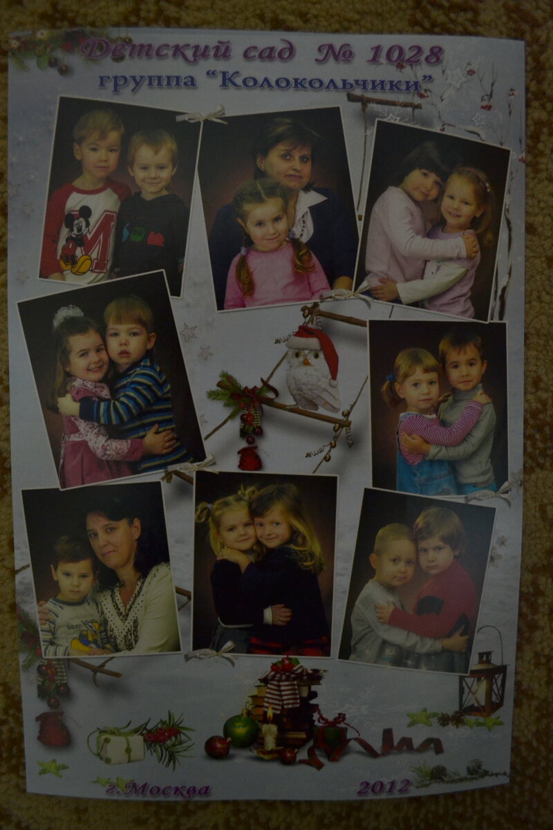 А на фотографии - наша младшая группа № 7 "Колокольчики". Я нахожусь в верхнем левом углу, а рядом мой друг - Стасик. Наши воспитатели: Ольга Викторовна и Елена Васильевна. Еще был помощник воспитателей - Любовь Петровна. Всё мы здесь ещё такие маленькие и смешные. Вы ещё увидите, как мы повзрослели к окончанию детского сада. Новогодний утренник Как и положено, 24 декабря 2012 года, в нашем садике прошел новогодний утренник. Костюмы можно было одеть любые, какие захотим. Я был в костюме пирата!