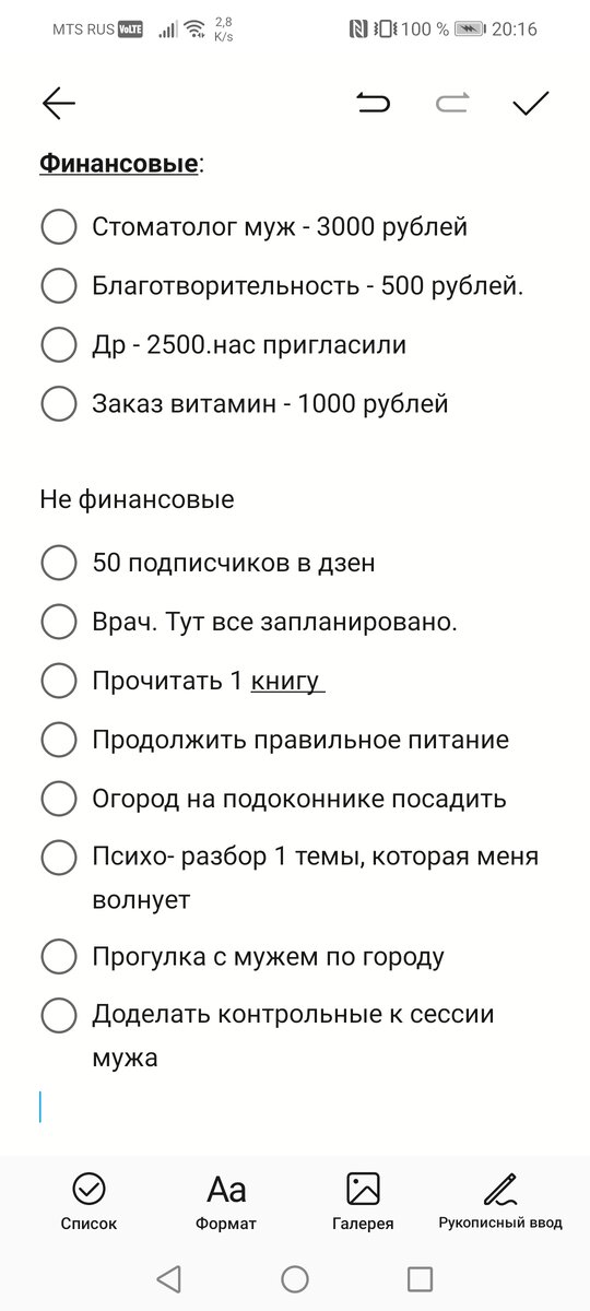 Итак, пришло время подвести итоги за прошлый месяц. О своих планах рассказывала тут: Пробежимся по ним: -стоматолог муж - нет, так как была поездка и ушло много денег. -благотворительность - в группе которой я доверяю сборов не было, поэтому нет. - стрижка мужа- засчитано, хотя стригся сегодня. - поездка - состоялась о ней писала тут: -30 подписчиков я набрала писала об итогах на дзен тут: -врача посетила. -книгу не прочитала,хотя сейчас читаю 2 штуки, не спеша. Одну с мужем вместе вслух, другую только я. - переход на правильное питание так и не состоялся. Но надо. -огород на подоконнике так и не посадила, надо купить грунт и тд. -психо разбор не сделала, думаю над сеансом с психологом. - витамины продолжаю пить -брови так и не покрасила, надеюсь сделать это завтра. -посмотрели с мужем фильм ю, даже несколько. Об этом напишу позже. -убрала все новогодние украшения. Мои планы на февраль 2024: