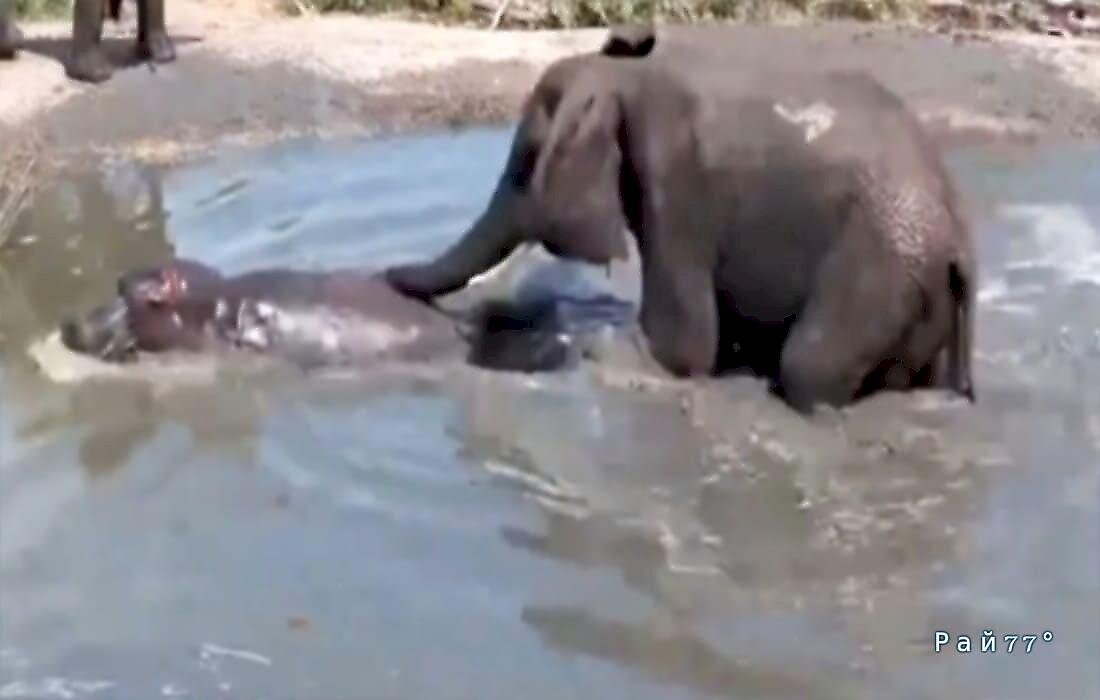 Противостояние произошло на глазах любителя дикой природы, написавшего в комментарии к сюжету, что воинственный слон, используя хобот, выпроводил один за другим бегемотов из водоёма.