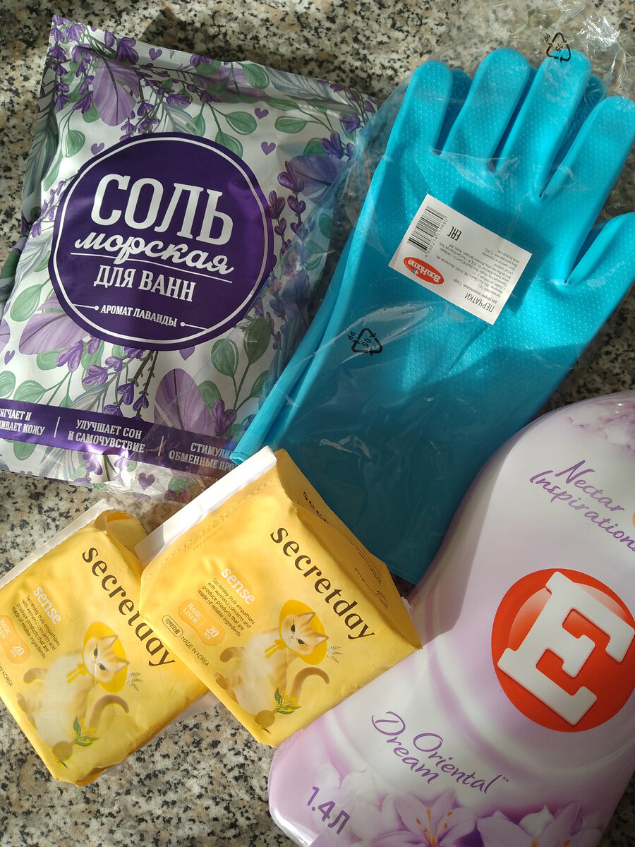 Моя закупочная неделя начинается по субботам, изредка по пятницам. На этой неделе с мясом решила пока притормозить, ещё то не съели, но подошла к концу бытовая химия. Фикс прайс В фикс шла намеренно за перчатками, но понюхала ополаскиватель, решила, что сейчас мне этот запах подходит. Любимый Грасс подождет. Всё кроме соли было запланировано. А соль - это мужу подарок. Ему нравятся лавандовые ванны. Магнит косметик Резинки тоже не по плану, но в целом мои резинки пора обновить. У меня осталась одна последняя, не считая пачки мелких, но они полностью хвост не захватят. Моей зубной пасты в фиксе и пятерке не было, а в магните она единственная без скидки. Обидно. Но знаете,я хоть и переплатила 150-200 рублей, но сознательно. Пастой Сплат я пользуюсь давно, на неё часто скидки, а ещё она не трёхцветная😂. Я не знаю почему, но муж не любит трёхцветную пасту. Но вот именно эта Сенситив Ультра очень мне помогла снизить чувствительность зубов. Свела практически на нет. Не с первого применения,