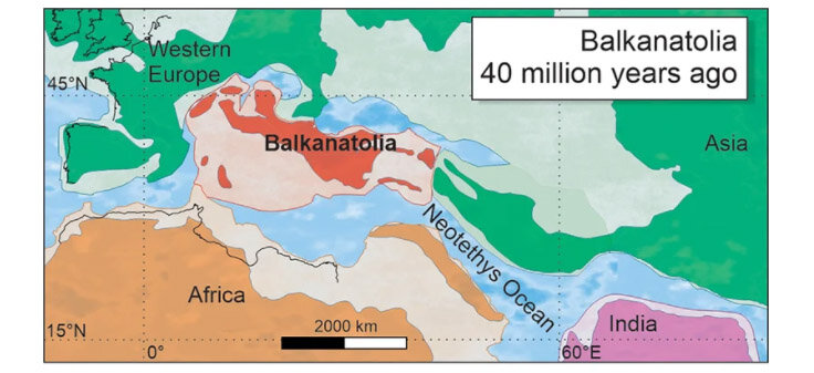 Десятки миллионов лет назад современные Балканы и Анатолия вместе составляли отдельный континент между Европой и Азией. Именно по нему несколько позже азиатские млекопитающие шли «колонизировать» Восточную Европу. По крайней мере, именно такая последовательность событий видится возможной международной команде учёных, которая назвала вероятный древний материк Балканатолией (Balkanatolia). 50 млн лет назад Балканатолия представляла собой изолированный континент, где сформировалась уникальная фауна, не похожая на животных, населявших тогда Европу и Азию. Однако понижение уровня моря и тектонические сдвиги привели к тому, что 40—34 млн лет назад Балканатолия превратилась в сухопутный «мост». Это позволило азиатским млекопитающим, включая грызунов и древних копытных, вторгнуться в Балканатолию и двинуться дальше — в Европу. Такой южный маршрут был предпочтительней, чем через высокие широты, с их более холодными и сухими степями. Одно из подтверждений открытия — находки костей ископаемых мле
