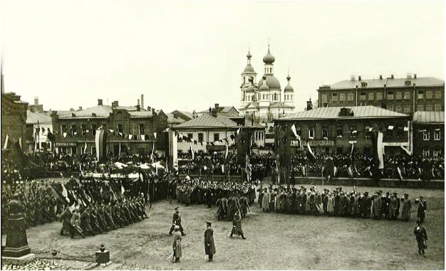 Поразительно, но на уникальных свидетельствах исторического события 22 октября 1913 года на том самом фото с прохождением роты Полка церемониальным маршем красуется случайно выбранный домишко целехоньким и обитаемым. Само строение светлое, небольшое и чуть неказистое, затертое между двумя более обстоятельными и затемненными особняками. С четырьмя по фасаду потухшими окнами, с горизонтальной обшивкой в дереве, за которым ласкает взор своими маковками Храм Живоначальной Троицы, куда спустя шестьдесят один год и довелось юркнуть вдвоем с дамой «вынужденной» самоволкой.