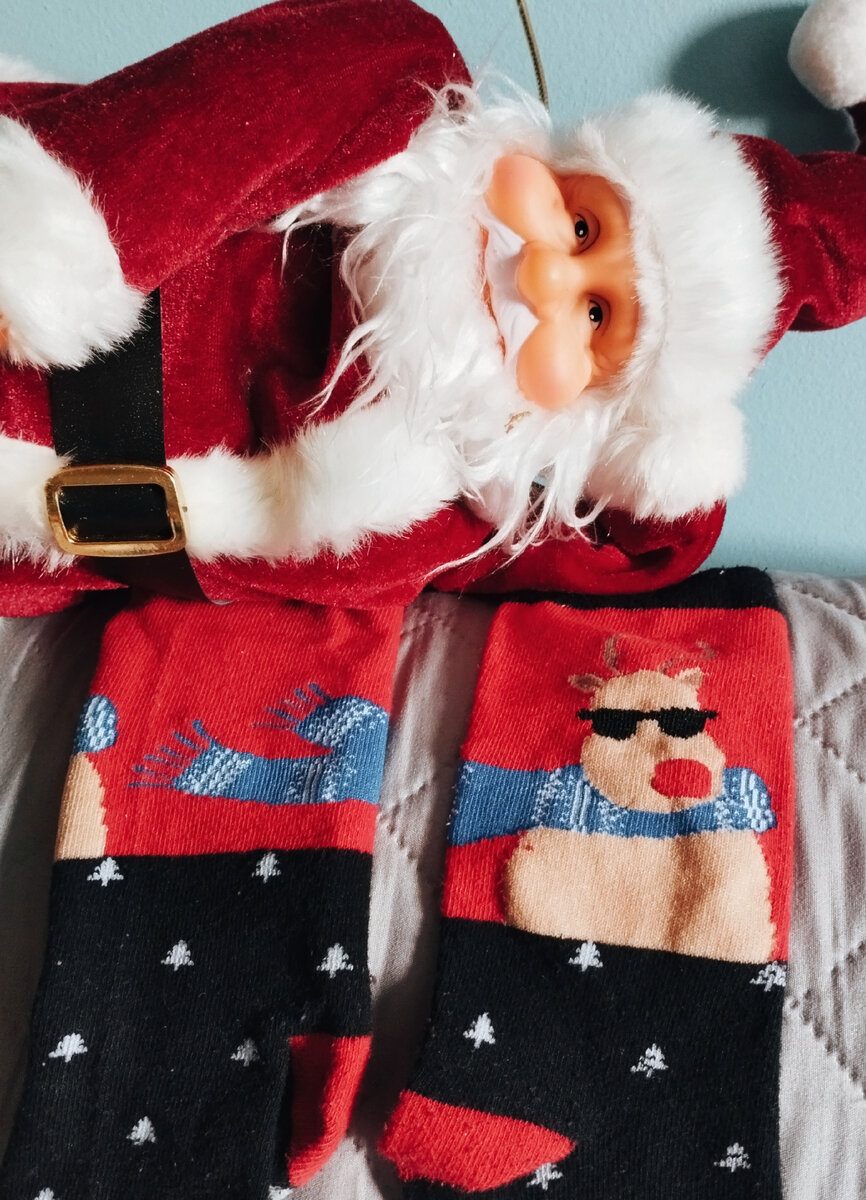 И там действительно, правда, довольно сиротливо, а не привлекательно, лежали две пары носков. Яркого цвета, зелено-красные, одни были с весёлыми мордочками оленей, а вторые - с колокольчиками. Новый год наступил, и вероятность того, что эти носки кто-то да купит была настолько мала, что даже цена и оранжевый картон не привлекали покупателей.