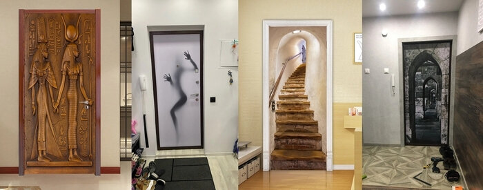 Такая же наклейка тольео с изображением коридора какого-то старинного за́мка. Смотрится так же интересно, главное не захотеть туда пойти не открыв дверь, для качественной обклейки двери, её поверхность должна быть чистой и обезжиренной, начинать клеить нужно сверху вниз, выравнивая клейкую поверхность плоской лопаткой, не стоит сразу отклеивать заднюю часть нелипкого слоя, а делать это постепенно. Ссылка