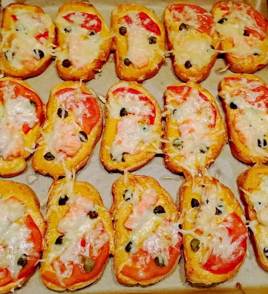 Простой и вкусный рецепт горячих бутербродов по мотивам пиццы "Сальмоне". Некоторое время назад из меню одной любимой пиццерии (название умолчу, но... Виват, пицца!) исчезла наивкуснейшая пицца - Сальмоне. Пришлось научиться делать ее дома самостоятельно. Иногда в виде горячих бутербродов. Состав: слабосоленая семга или форель, креветки,каперсы, помидоры, красный лук, сыр твердый, соус (майонез+кетчуп), батон. На большой противень у меня помещается 15 штук. Смазываем соусом (майонез и кетчуп), выкладываем дольку помидора, рыбку, креветку(без неё тоже вкусно), каперсы (3-4 шт.) и сверху тёртый сыр (пармезан/любой твердый сыр). В духовку помещаем на 30минут при температуре 200°. Особый вкус придают именно каперсы. Попробуйте, приятного аппетита!