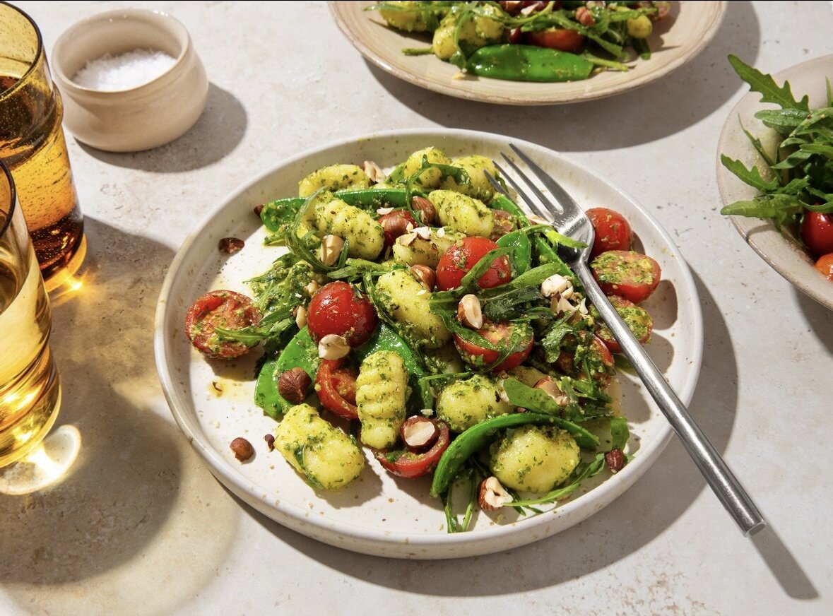 Сложность: легкий рецепт Время приготовления: 20 минут Ингредиенты (на 3 порции): Берем большую кастрюлю, доводим воду до кипения и солим. Далее добавляем клецки и половину нашего зеленого горошка/ стручковой фасоли. Готовим в соответствии с инструкциями на упаковке до состояния аль денте. Затем сливаем воду, все промываем холодной водой и откладываем в большую миску. Помидоры черри разрезаем пополам, оставшийся сырой зеленый горошек/ стручковую фасоль нарезаем по диагонали тонкой соломкой и выкладываем в миску. Нарезаем крупно петрушку. Цедру половины лимона натираем на терке и отжимаем сок. Очищаем зубчик чеснока. Далее крупно нарезаем несколько лесных орехов и откладываем их для украшения. Добавляем петрушку, 1 ст.л. лимонного сока, целые лесные орехи, оливковое масло и чеснок в мерный стакан. Взбиваем блендером до получения однородной массы песто. Приправляем по вкусу солью и перцем. Добавляем песто к приготовленным клецкам и стручкам гороха/фасоли и хорошо перемешиваем