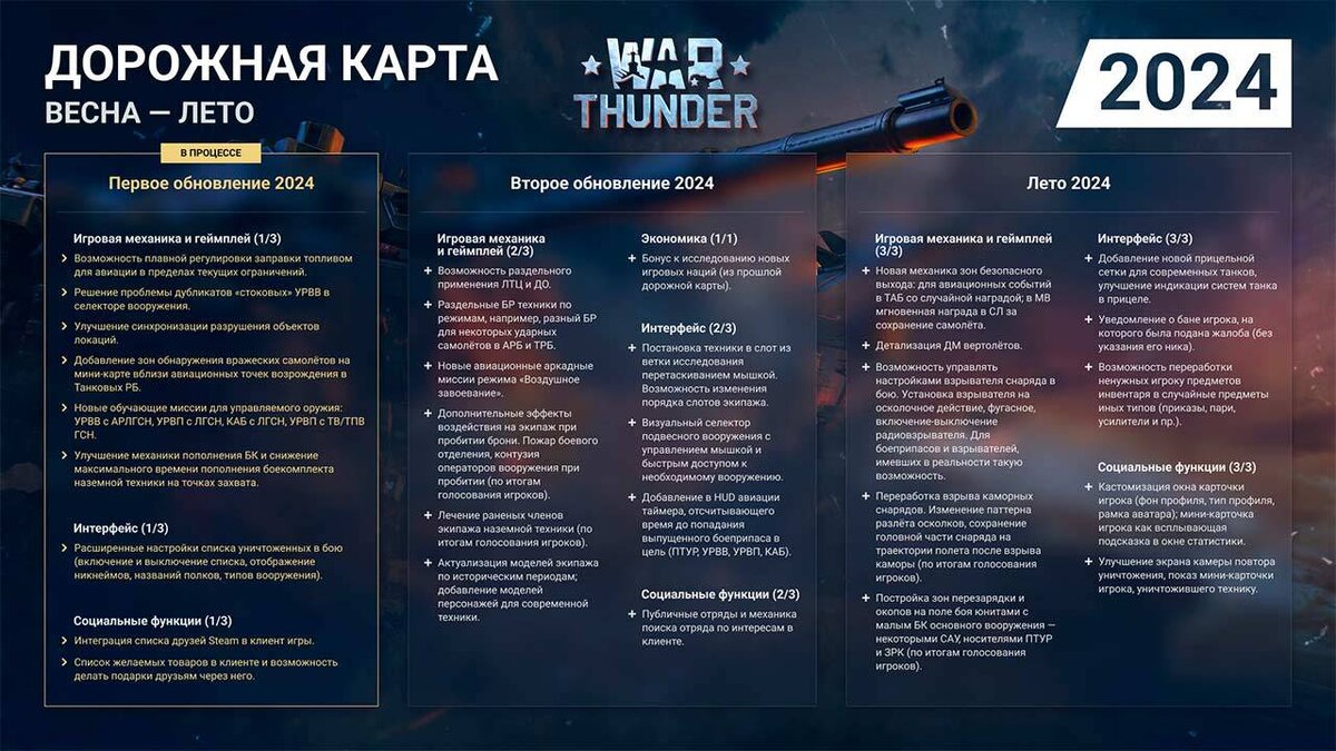 Разработчики масштабной военной игры War Thunder продолжают развивать свой проект, опубликовав план обновлений на весну и лето 2024 года с массой разноплановых нововведений. Уже в первом крупном обновлении обещают интегрировать список друзей Steam в клиент и возможность добавлять игровые товары в список желаемого с последующей механикой подарков товарищам. Также поработают над синхронизацией разрушения объектов на картах, обучающими миссиями по управляемым типам оружия, пополнением БК наземной техники. Второе дополнение будет содержать аркадные миссии для режима "Воздушное завоевание", больше эффектов воздействия на экипаж при пробитии брони, лечение членов экипажа и их исторические модели разных периодов. Также введут бонусы к исследованию новых наций, открытие отряды и улучшения интерфейса. Летом выпустят ещё одно масштабное обновление. Авторы обещают функции кастомизации окна с карточкой игрока, переработки ненужных предметов, уведомление о бане игроков после жалоб. Проведут детали