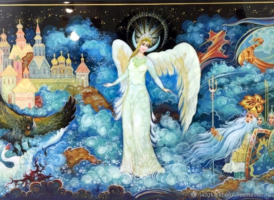 Разумеется, царь в этой сказке - он. Он в центре этой картинки. А рядом с ним царевна-лебедь, у которой не только звезда во лбу горит, она еще, как вы помните, волшебница. И не меньше!