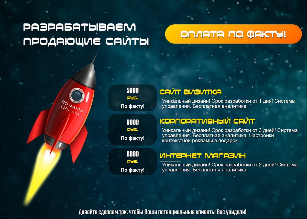Услуги по созданию сайтов с оплатой по факту Введение В нашей компании По-факту мы предлагаем профессиональные услуги по созданию сайтов, с особенностью оплаты по факту выполненной работы. Мы стремимся предоставить качественные веб-решения, которые отвечают вашим требованиям и помогают достичь ваших бизнес-целей. В этой статье мы расскажем о наших услугах, стоимости и сроках создания сайтов, а также дополнительных сервисах, которые мы предлагаем. Услуги по созданию сайтов Мы предлагаем полный цикл разработки сайтов, начиная от концепции и дизайна, до программирования и запуска. Наша команда опытных разработчиков и дизайнеров готова превратить ваши идеи в функциональные и привлекательные веб-сайты. Мы специализируемся на создании сайтов различной сложности, от простых лендингов до интернет-магазинов и корпоративных порталов. Стоимость и сроки создания Стоимость создания сайта начинается от 5 тысяч рублей. Окончательная цена зависит от сложности проекта и его функциональных требований. М