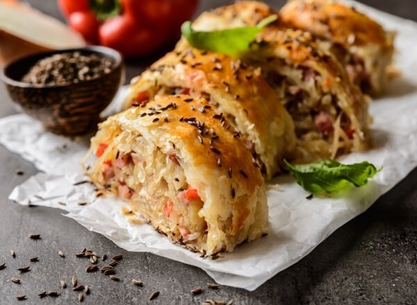 Пирог с квашеной капустой — это простой рецепт вкусного слоёного рулета, который требует минимальной подготовки и быстрой выпечки. От начала готовки до подачи на стол проходит чуть больше 45 минут — и вкусный пирог на вашем столе! Поскольку у меня осталось немного квашеной капусты, я решила использовать её для выпечки пирога в виде рулета из готового слоёного теста. В начинку из квашеной капусты я добавила половину красного болгарского перца, лук и немного ветчины. Кстати, вместо ветчины можно использовать любую колбасу, сосиски, сардельки или просто оставшиеся от бульона кусочки курицы. Мясной добавки понадобится совсем немного. Также вместо болгарского перца, если у вас его не продают зимой, можно добавить морковь. Я покупаю 1 упаковку (2 листа) слоёного теста — так приготовление пирога-рулета занимает минимальное время, можно даже приготовить пирог на завтрак, особенно, если у вас есть готовая начинка. Но, конечно, никто не запрещает использовать домашнее слоёное тесто, если вы реши