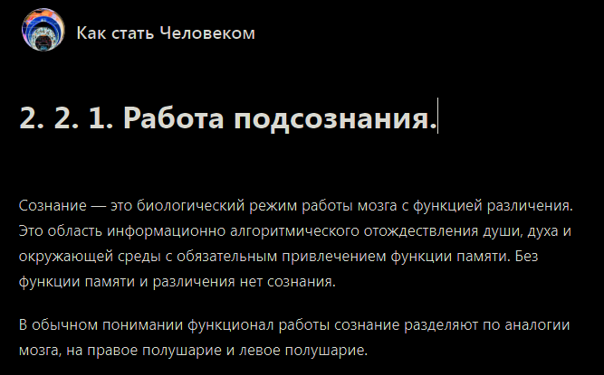 Самая большая тайна, скрываемая от толпы в том, что достигнув совершеннолетия, человек в состоянии (при наличии нужной информации и методологии) выступать лично своим, собственным программистом своего подсознания. А не быть и не оставаться заложником, к примеру, извращенного воспитания и образования от довлеющей рабской культуры всю оставшуюся жизнь. Как по большому счёту и происходит практически со всем населением России и всего Мира современного образца. То есть, настоящая свобода человека это как раз уметь править своё подсознание, править дерево нравственности, лично загружать необходимые стереотипы поведения, дабы в последствии определив осознанно и наметив необходимую цель в жизни, быть уверенным, что всё отработается на автомате лучшим образом. И что он может достигнуть именно того, что хотел, а не то, что хотели паразиты, когда через СМИ и всю культуру вгоняли в его подсознание нужные им алгоритмы, по которым человек всю жизнь кормил бы их, одевал, обувал, и убирал за ними дерьмо. И всё это делал практически на автомате, в скрытой от его сознания форме рабовладения (ссудный процент, идеологии, мировоззрения – люди литл-пипл).