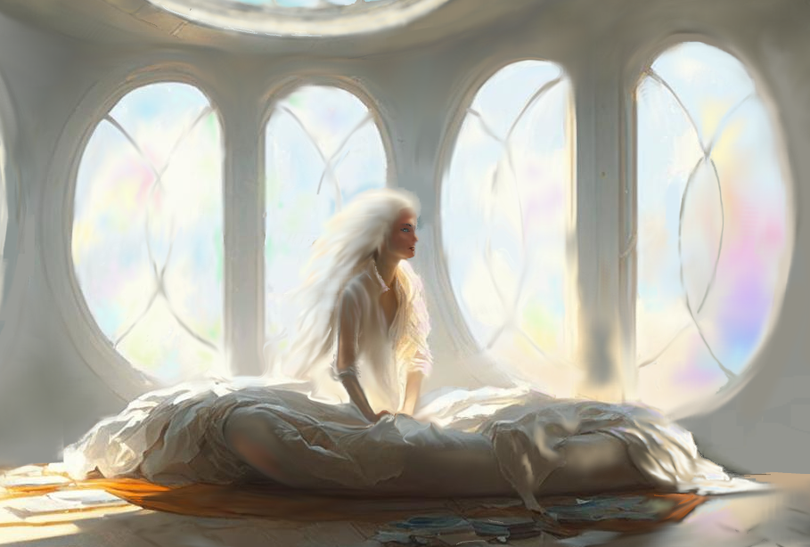 Становилось светлее, и вокруг проявлялись новые детали и краски. Гигантское ложе, на котором я восседала, стояло посреди круглой, размером с цирковую арену, комнаты. За спиной у меня громоздилось с десяток подушек разного размера и формы. Лёгкое одеяло было простёгано вычурным "морозным" узором. Нежно-шелковистая и очень тонкая ткань постельного белья и ночнушки оказалась приятного молочно-белого оттенка. Под потолком клубились пушистые, будто опалесцирующие палитрой предзакатного чистого неба, облака. Крохотные зелёные молнии с едва слышным шипением вспарывали их пухлые бока. Вздрагивая от негромких мелодичных раскатов грома, облака роняли вниз искрящиеся капли дождя. Не пролетев и пары метров, они тут же исчезали. Я восторженно наблюдала это явление, пока звук лязгающего в отдалении металла не отвлёк меня от созерцания прекрасного и не вернул к злободневному. А на злобе дня у меня была единственная задача: определить, где я нахожусь, и что я есть теперь такое. Я осторожно сползла с