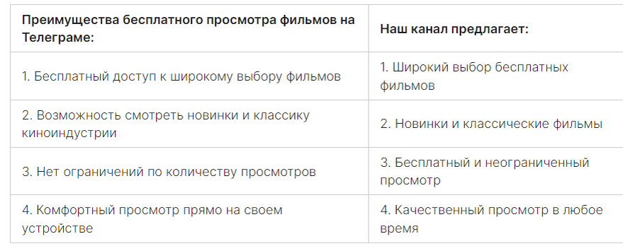 В этой статье я расскажу вам о лучшем Телеграм канале, где вы можете смотреть любимые фильмы абсолютно бесплатно. Наслаждайтесь просмотром фильмов на своем устройстве с помощью Телеграма! Плюсы ➕ Лучший канал для просмотра фильмов💍 Откройте для себя лучший Телеграм канал, где вы найдете огромное разнообразие фильмов всех жанров. Здесь вы сможете смотреть фильмы абсолютно бесплатно и наслаждаться комфортным просмотром прямо на своем устройстве. Наш канал предлагает только качественные фильмы, которые можно смотреть в любое время! Бесплатные фильмы на Телеграме🎦 Один из самых больших преимуществ Телеграма - возможность смотреть фильмы абсолютно бесплатно. Наш канал предлагает широкий выбор бесплатных фильмов, включая новинки и классику киноиндустрии. Получите доступ к бесплатному просмотру фильмов прямо сейчас и наслаждайтесь своими любимыми картинами без ограничений! Не упустите возможность наслаждаться своими любимыми фильмами абсолютно бесплатно на Телеграме! Получите доступ к наше