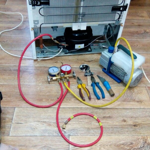 Утечка фреона – часто встречающийся дефект. Что бы устранить его необходимо найти место утечки, устранить не герметичность, далее поменять фильтр-осушитель так как вместе с воздухом в холодильный контур попадают пары воды, отвакуумировать холодильный агрегат и произвести заправку фреона. Выполнение всех этих работ невозможно без комплекта специального оборудования и инструментов. Понадобятся течеискатель, вакуумный насос, заправочный коллектор и фреон.