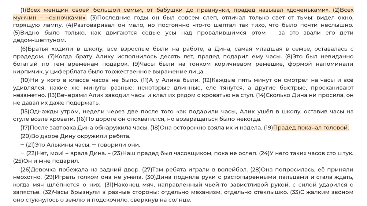 Исходный текст (Источник: Открытый банк заданий ФИПИ 2024 года) 13.3 Напишите сочинение-рассуждение на тему «Что значит понять другого человека?». Дайте определение понятию ПОНИМАНИЕ и прокомментируйте его, ответив на вопрос, сформулированный в теме сочинения. Понимание — это способность человека чутко относиться к окружающим, прощать их недостатки. Что же значит понять другого человека? Я думаю, это значит суметь почувствовать его боль, поставить себя на его место и постараться понять поведение другого. Приведу примеры, чтобы доказать эту мысль. В тексте Л.Е. Улицкой бесконечным пониманием ближних наделён прадедушка Дины. В предложениях 1–2 говорится о том, что он всегда был ласков с домочадцами, называл “доченьками” всех женщин, а “сыночками” — всех мужчин своей большой семьи. Своему правнуку Алику он подарил часы — “невиданно богатый по тем временам подарок” (предложение 8). Когда Дина без спроса берёт Алькины часы, чтобы похвастаться перед ребятами, прадед не ругает её. И даже пос