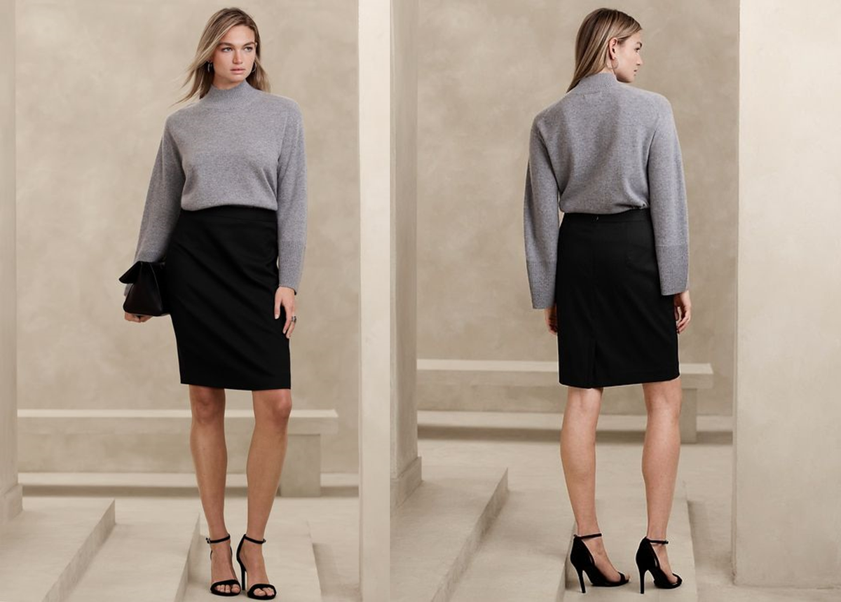Любите прямые юбки, носите чуть зауженный силуэт на высокой талии и следите, чтобы она заканчивалась строго в середине колена или полностью его закрывало, тогда ваши ноги будут выглядеть безупречно.