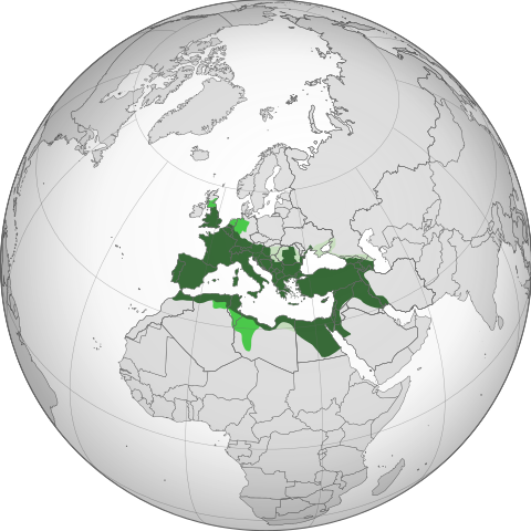 Первые два века существования Римской империи были периодом беспрецедентной стабильности и процветания, известного как «римский мир». Рим достиг своего наибольшего территориального расширения во время правления Траяна (98—117 годы нашей эры); период нарастающих проблем и упадка начался с правления Коммода (177—192). В третьем веке Империя пережила кризис, угрожавший ее существованию, поскольку Галльская империя и Пальмирская империя отделились от Римского государства, и империю возглавил ряд недолговечных императоров, часто из легионов. Римская империя была воссоединена при Аврелиане (270—275). Чтобы стабилизировать Римскую империю, Диоклетиан в 286 году учредил два разных имперских двора на греческом Востоке и латинском Западе; христиане пришли к власти в 4 веке после Миланского эдикта 313 года. Вскоре после этого период миграции, включавший крупные вторжения германских народов и гуннов Аттилы, привел к упадку Западной Римской империи. После падения Равенны под натиском германских герулов и низложения Ромула Августула в 476 году нашей эры Одоакром Западная Римская империя окончательно распалась; император Восточной Римской империи Зенон официально упразднил Западную Римскую империю в 480 году нашей эры. Восточная Римская империя просуществовала еще одно тысячелетие, до 1453 года, когда Константинополь пал перед турками-османами под предводительством Мехмеда II[~ 1].