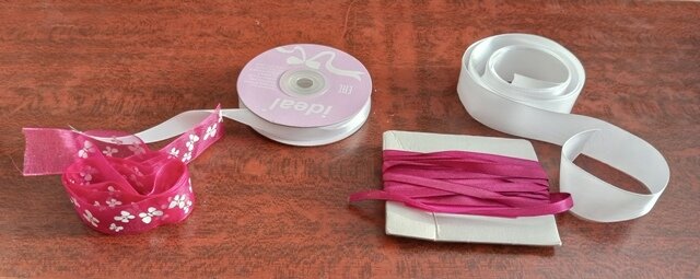 В своих закромах я нашла целых 85 см малиновой ленты из органзы с белым рисунком «Бабочки». Она то и вызвала во мне желание сотворить очередной бант на резинку для волос. 1. Также мне понадобятся и другие ленты. 2. Но начну я все же с белой атласной ленты шириной 25 мм. Нарезаю ее на кусочки по 10 см. для двух бантиков я нарезала 10 штук. Края опаляю спичками. 3. Разделила их на равные кучки. 4. Ленту с бабочками нарезала на 10 кусочков по 8,5 см. Края также опаляю спичками, очень осторожно. 5. Также разделила их на две кучки. 6. Теперь соединяю их попарно. Сначала сгибаю белые ленточки пополам. Закрепляю булавкой. 7. Малиновую ленту из органзы тоже складываю пополам. Накладываю поверх белой заготовки. Срезы всех четырех концов совмещаю. Закрепляю булавкой. 8. Так складываю 5 лепестков для одного банта. 9. По нижнему краю прошиваю ручным швом «вперед иголку» иголкой с ниткой в два сложения. 10. Не обрезая нитки, прошиваю все 5 заготовок. 11. Стягиваю шов. Замыкаю в кольцо. Закрепляю у
