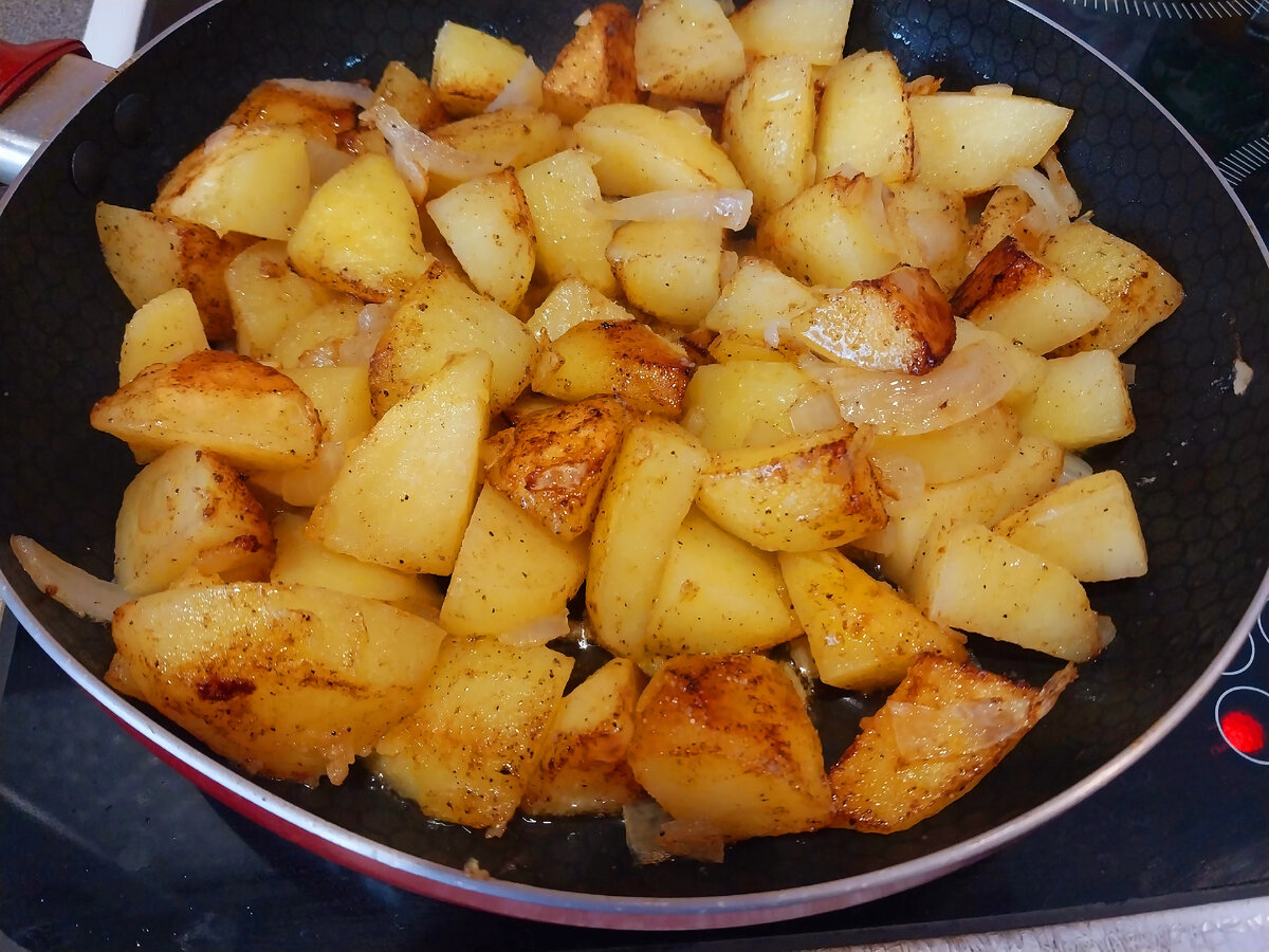 Хочу поделиться простым и очень вкусным рецептом жареной картошки по-особенному!!! Получается с румяной хрустящей корочкой и нежная, мягкая внутри. Чистим и моем несколько картофелин Режем крупными брусочками Добавляем красный острый перец, паприку и чёрный перец, солить пока не надо Перемешиваем Накрошим репчатый лук Нагреваем хорошо сковороду, наливаем растительное масло И выкладываем картофель Сверху выкладываю репчатый лук Закрываю крышкой, огонь чуть выше среднего. Не трогаю минут 5-7 По истечении 5-7 минут перемешиваем и вновь накрываем крышкой Спустя 5 минут открываем крышку, солим по вкусу и вновь перемешиваем, чуть-чуть убавить огонь и готовим ещё 5 минут под крышкой Ну вот и готово! Ароматная, хрустящая и румяная корочка. М-м-м, очень вкусно! Огромная просьба - поставьте лайк, я очень стараюсь и по возможности напишите комментарий. Это придает мне настроение и силы делиться с вами простыми и вкусными рецептами. Спасибо и до новых встреч!