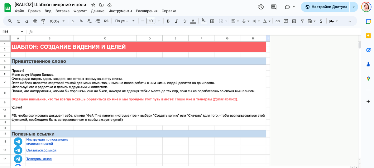 Острая проблема, которую часто люди вокруг не считают таковой - не знаю чего хочу. При этом люди точно знают чего и как они не хотят. По этому случаю мне очень откликается метафора с навигатором: когда вы задаете пункт назначения в навигаторе и пишите "только не Красная площадь", как вы думаете, куда вас приведет навигатор? На Красную площадь или куда-то рядом. Долгое время я думала, что я знаю чего хочу. Пока всерьез не озадачилась этим вопросом, перепробовала кучу методик и посвятила этому 3 года. Видение и цели – это не общее представление, а вполне конкретные качественные и количественные характеристики. И часто, работая с этим мы себе от души пизд*м 🙈 Когда есть четкое видение, любимые цели - жить становится очень легко, уходит суета, появляется интерес к жизни и ты растешь быстро и в кайфе. По ссылке шаблон для работы с личным видением и целями. Инструкцию можно посмотреть здесь. На первой странице есть короткое пояснение о том, как им пользоваться. И не забывайте ставить реак