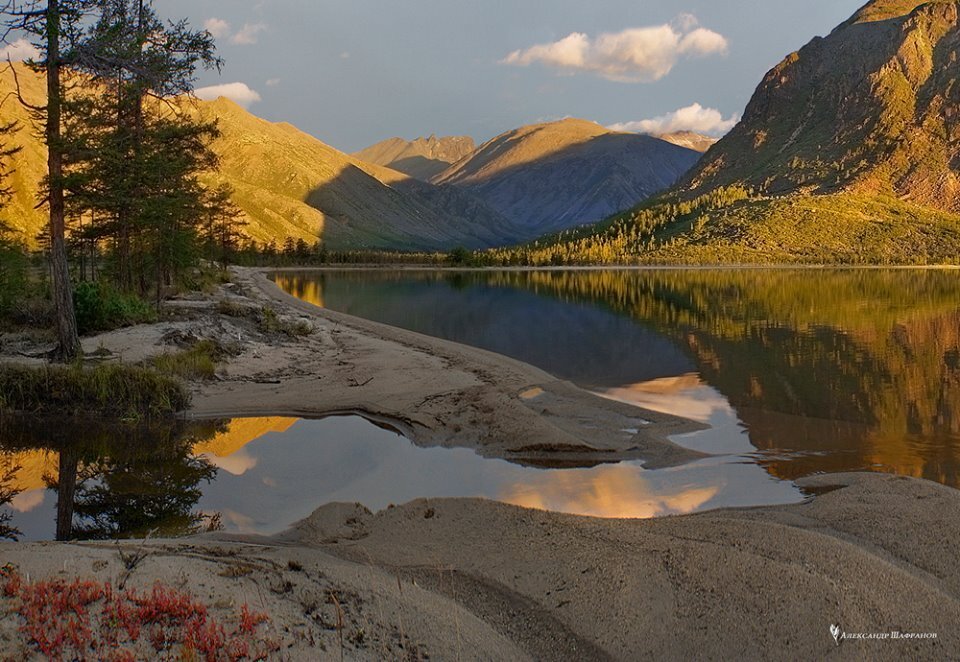 Продолжение. Начало здесь: Эмтегей 85’ Колыма реальная и мистическая Ну вот. Рюкзаки за плечами, машина заперта на ключ, и мы начинаем подъём на сопку по узкой тропинке. У подножия горы очень глубокий мох и высокие кусты багульника сильно затрудняют ходьбу. Особенно мне. Эти двое длинноногих прут, как по асфальту, едва за ними поспеваю. Да ещё на ходу срываю с кочек морошку. Она ещё твёрдая, но вку-у-сная-а-а-а! И вот выходим на осыпь курумника, и идти становится гораздо легче. Проходим мимо зимовья, оставляя его слева внизу у ручья, и выходим на брусничник. Собственно, брусничник-то здесь везде, тут вообще нет ни одного квадратного метра без брусники, но нам нужно, чтоб её было по-настоящему много. Так, чтобы не мучиться и собрать ведро за час-полтора. Ох, какая красота! Ягоды такие крупные и растут так густо, что листвы почти не видно. Кажется, что на камни кто-то вылил гигантскую цистерну с красным вареньем. Теперь — за работу. На самом деле это совсем не трудно, даже приятно — соби