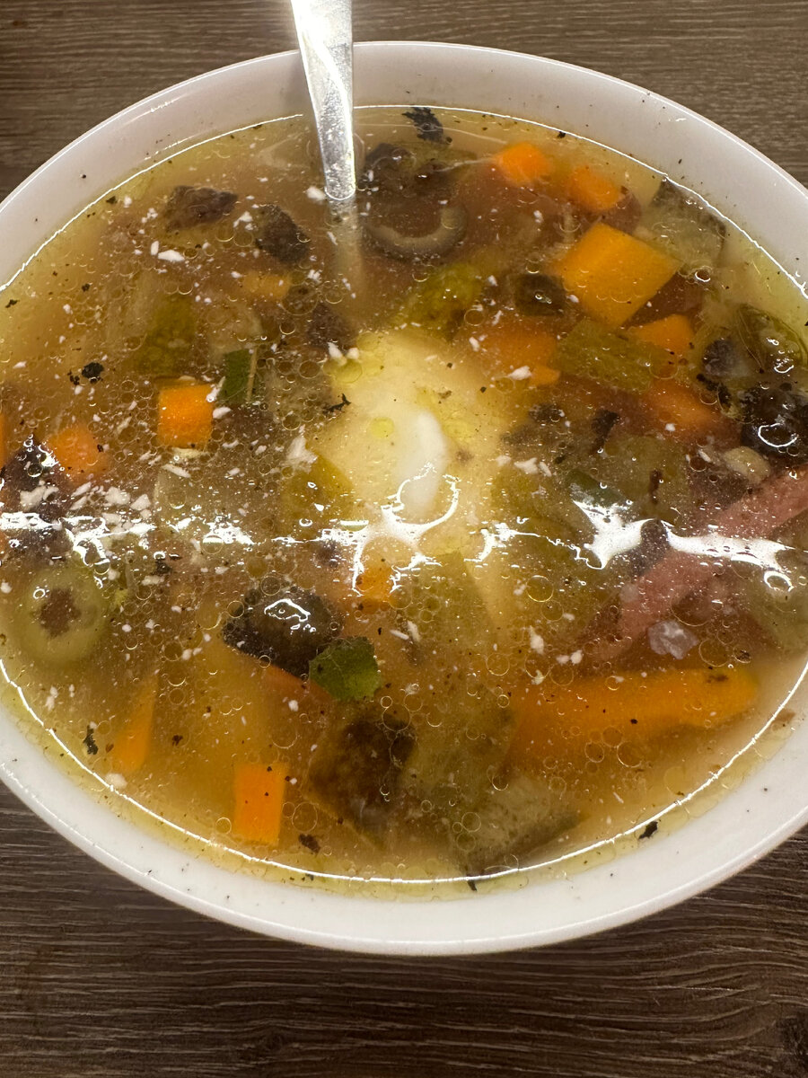 На прошлой неделе я готовила преимущественно из овощей и без сахара. Решила провести диетический эксперимент, овощи использовала из заморозки и свежие. И так, что я готовила: Солянка на бульоне из грудины, для аромата заправленная небольшим количеством колбасы двух видов (остатки хвостиков). Вместо лимана использовала лайм Дети ели со сметаной, я - без. Ребра запекла в духовке с замороженной овощной смесью: Соус - бальзамик. Студенты на гарнир отварили себе макароны, из остатков я сделала молочный суп. По просьбе трудящихся делала грибную подливу, которою заточили с зерновыми макаронами и с гречкой, блины, которые я не ела, а студенты - со сметаной и малиновым вареньем, из остатков гречки делала молочный суп, диетическую творожную запеканку с яблоком и без сахара. На завтрак торжественно подавала отварные яйца), творог с топингом на выбор (я - с домашней аджикой), йогурты на сладкое. Варили морс и компот. Ну и полезные овощные салаты в течение недели: Салат из свежих перцев и черри