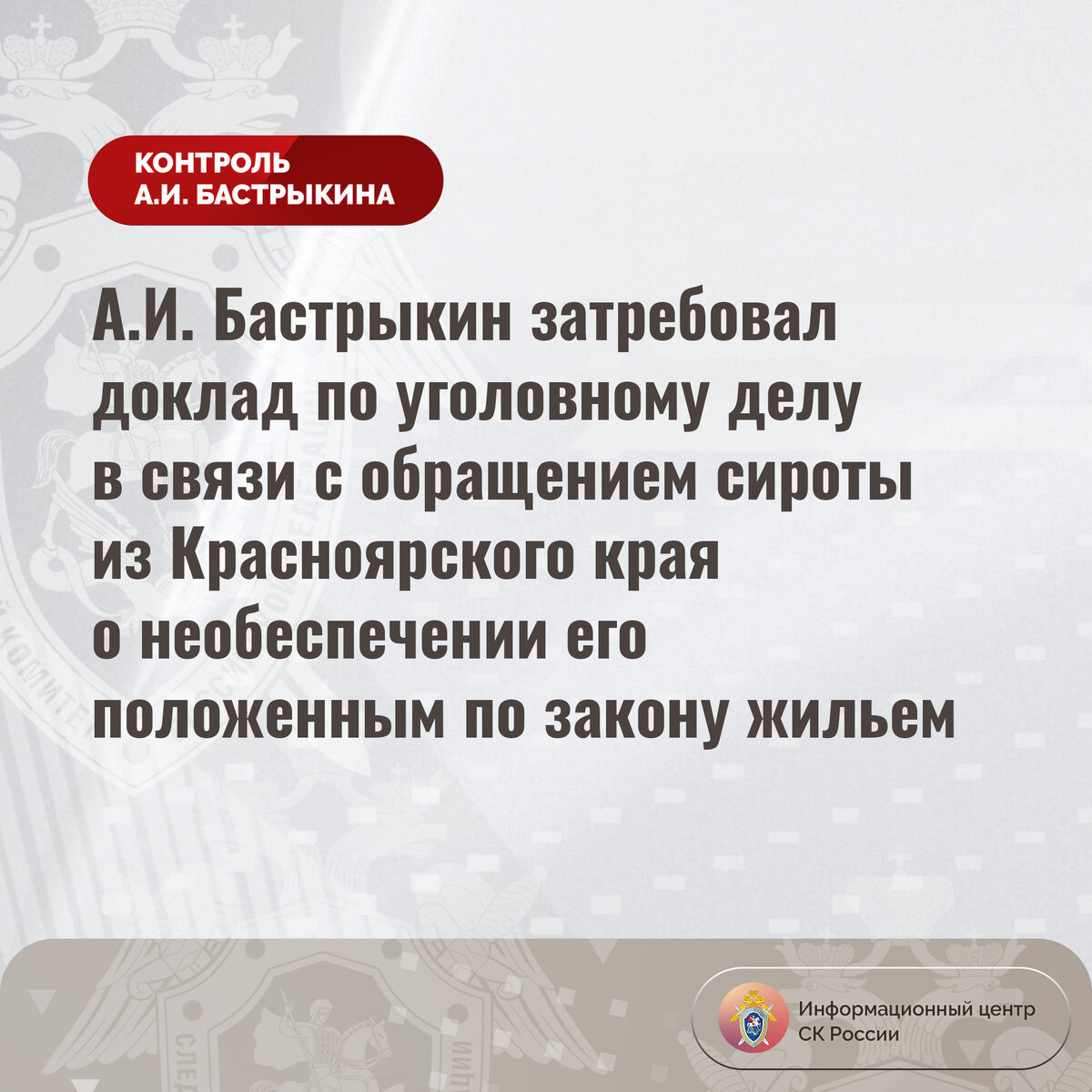 А.И. Бастрыкин затребовал доклад по уголовному делу в связи с обращением сироты из Красноярского края о необеспечении его положенным по закону жильем