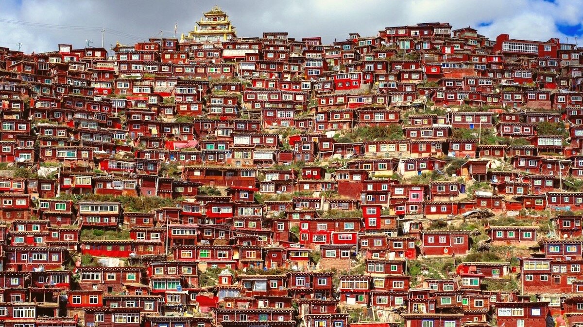 Но вот уже, наконец-то, на высоте свыше четырёх тысяч метров, глазам предстаёт фантастическая картина долины, где на склонах прилепились сотни маленьких домишек. Они однотипные — один этаж, красно-коричневая окраска стен и крыш — и стоят так тесно, что кажется, если вдруг рухнет один из них, то с горы посыпятся, как горох, и все остальные. Это и есть Ларунг-Гар. Его часто называют монастырём, но правильнее сказать «университет» или «академия». Здесь проходят обучение тысячи монахов как мужчин, так и женщин, что является редким исключение из общепринятой практики.