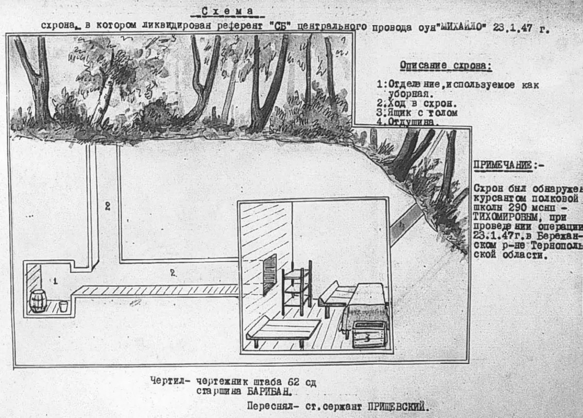 "Однажды нашли очень большой схрон, глубоко под землей. Они бывало делали их глубиной от трех до восьми метров глубиной, все тщательно обшивали досками и брусом, бетонировали. Из-за этого в них тепло было всегда, ну и в целях безопасности, чтобы земля не обвалилась. Так вот, этот наверное на глубине метров восемь был. Много лазов всяких, комнат. Так в одной из комнат даже трюмо стояло. Скорее всего зеркало забрали у кого-то из местных жителей, смотрелись в него. Была и комната-склад. В ней обнаружили бочку меда, бочку с мясом, сало, много сушеных продуктов, чтобы за зиму не пропадали. Много чего было, мы в отряд потом все забрали. Правда тут надо было быть аккуратным, проверяли все тщательно. Бывали случаи, когда бойцы травились горилкой или продуктами какими. Бандеровцы специально такие нам оставляли, на случай если схрон накроют. Ну а какой нормальный человек откажется от кусочка сала, когда сам в засаде в лесу неделями сидишь без нормальной еды".