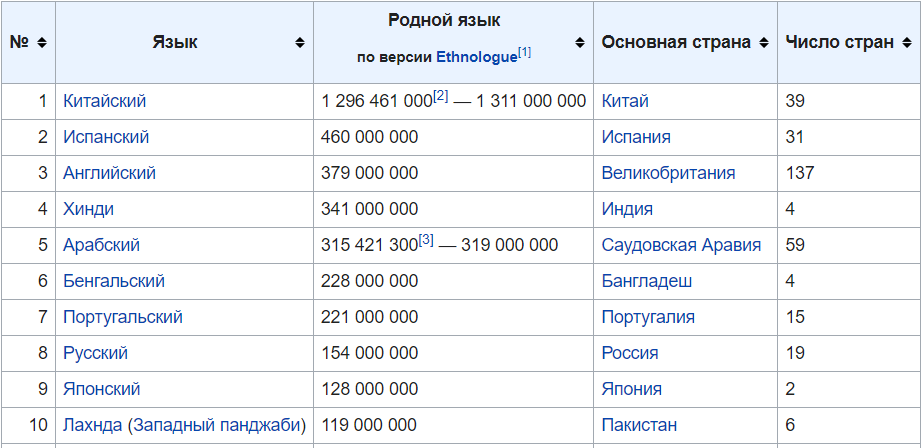 Для начала, давайте возьмем топ языков по миру. Я не разобрался в рейтингах (они оказались с разными результатами), поэтому я взял за основу данные википедии А инфу они взяли у Ethnologue, поддерживаемого институтом SIL International Китайский в топе везде, а испанский, хинди и английский делят следующие места. Но тут надо разобраться детальнее. Что Китай, что Индия имеют нереальное количество жителей, оттуда популярность языка. Но кроме этих стран больше на них говорить негде. Английский самый пропиаренный и включен в обязательную программу обучения в школе во многих странах. Только вот если мы с одним и тем же английским приедем в США, Англию, Австралию, Ирландию или Шотландию, то вас ждет неприятный сюрприз) диалекты ну очень сильно различаются. Тем не менее, на испанском говорят на 2 материках, а латиносов и испанцев можно встретить очень много где. Даже в родном небольшом Оренбурге удалось встретить испанца в магазине «Metro cc». И с общей международной базой испанского языка можн
