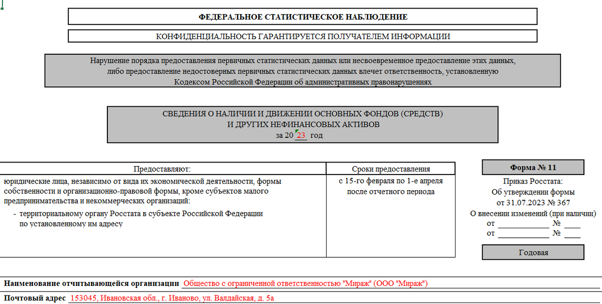 Используя форму 11, все юрлица, кроме тех, которые относятся к СМП и НКО, должны ежегодно отчитываться в Росстат (с 15 февраля по 1 апреля года, следующего за отчетным) о наличии и движении основных средств и иных нефинансовых активах (НФА), используемых в бизнесе.