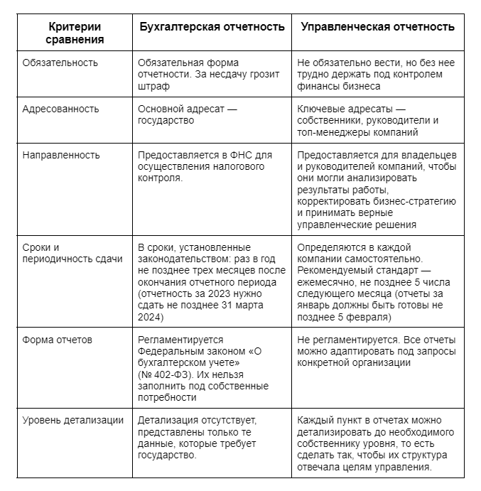 Управленческая отчетность выступает как внутренний финансовый инструмент, неотъемлемый для эффективного управления предприятием. Этот вид отчетности предоставляет владельцу компании актуальную информацию о текущем финансовом положении, что важно для разумного распределения ресурсов и принятия обоснованных решений. Основной задачей управленческой отчетности является не просто отображение финансовой стороны дел, а реальная возможность умножить прибыль. Управленческий учет – необязательный вид учета, которым предпочитают пользоваться руководители, топ-менеджеры для контроля определенных показателей. Особенности управленческой отчетности: Отличия управленческой отчетности от бухгалтерской: Необходимо четко разграничивать управленческую отчетность и бухгалтерскую. Если бухгалтерская отчетность является формой обязательной финансовой отчетности перед государственными органами, то управленческая отчетность предназначена для внутреннего использования и направлена на анализ и управление бизнесо