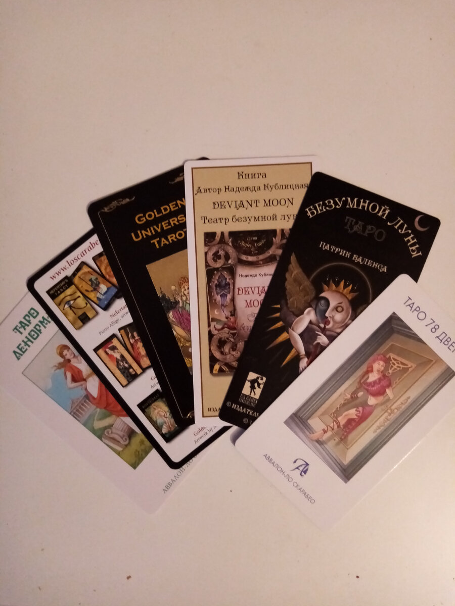 Если вы хотите получить быстрый ответ на свой вопрос или дать совет подруге.... Мой топ 5 универсальных колод Таро. Вы тоже не выходите из дома без Таро в сумочке? Напишите согласны ли вы с моим выбором,поделитесь своим. Представляю колоды по нарастающей: 1."Золоченое королевское Таро" Марчетти.Очень яркая, но иногда, хочется глаза порадовать. 2."78 дверей". Говорящая, понятная, часто уходит в себя. 3."Темный особняк". Колода с юмором. 4."Таро Безумной Луны". Хирургическое вмешательство без наркоза. 5."Золотое универсальное Таро" и классика "Таро Смит-Уэйта". Наше всё.