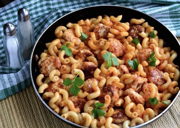 Макароны с томатным соусом - довольно популярное блюдо, которое подают в качестве гарнира. А как насчёт того, чтобы приготовить и гарнир из макарон, и мясное блюдо одновременно? Обжаренные куриные фрикадельки отлично сочетаются с макаронами и томатным соусом. Прекрасное решение для семейного обеда или ужина.