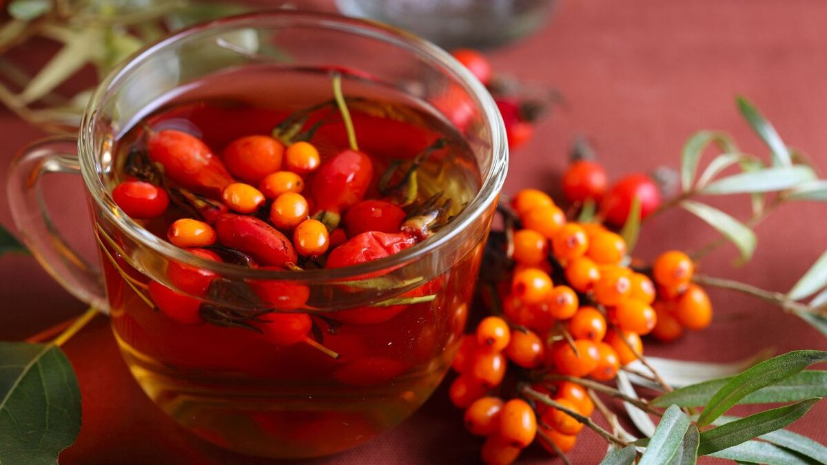 перетрите ягоды облепихи с сахаром и проварите на слабом огне в течение 5 минут. Выложите получившееся ягодное пюре в термос, добавьте черный чай, варенье, грушевый сок, мед и залейте кипятком. Настаивайте напиток около получаса — и приступайте к чаепитию!