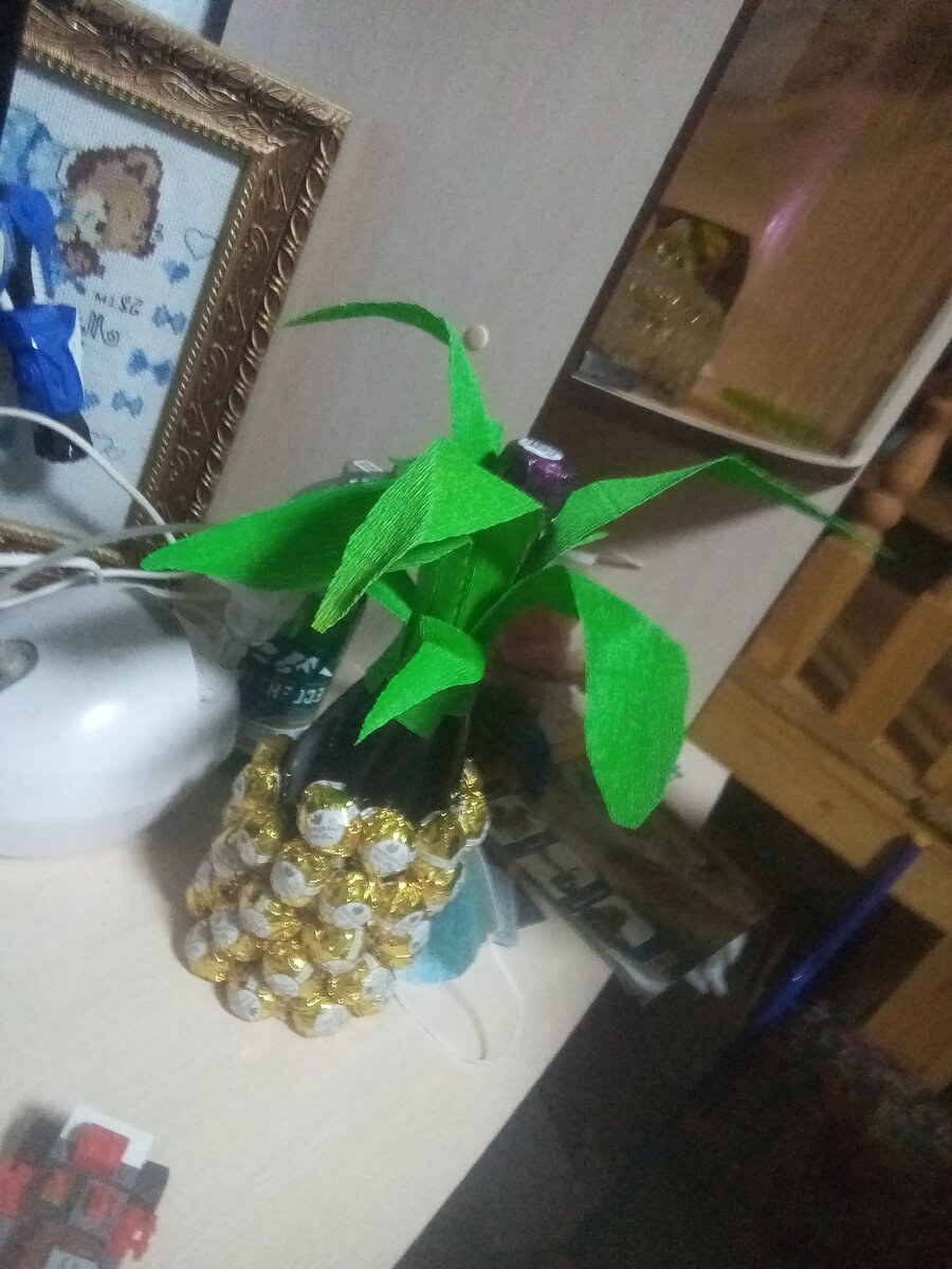 Добрый день друзья Расскажу вам о создании подарка своими руками на любой праздник, будь то день рождения, новый год, 8 марта, 23 февраля и другие... Что нам понадобится : Начинаем процесс изготовления : Берём стол и располагаем на нем шампанское и конфеты Включаем пистолет для клея в розетку, разогрева его и наносим клей на каждую конфету приклеиваем её к бутылке, начиная со дна и обклеиваем её рядами в шахматной порядке Теперь берём фетровую бумагу и вырезаем листья разной длины и приклеиваем к бутылке С помощью карандаша закатывает листья, придавая им нужную форму В конце работы привязываем бантик сделанный из ленты (можно купить готовый в магазине Упаковочка) И вот результат вашей работы Не забудьте выключить термопистолети не оставляйте без присмотра Спасибо за прочтения Если вам понравилось изделия подписывайтесь, ставте лайк и можете заказать его у нас мы изготовим его для вас в короткие сроки До новых встреч🏆