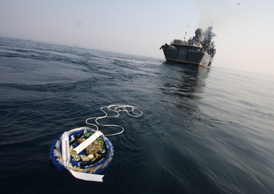 Экипажи отряда боевых кораблей Тихоокеанского флота в составе флагмана Тихоокеанского флота гвардейского ордена Нахимова ракетного крейсера (ГРКР) «Варяг» и фрегата «Маршал Шапошников» во время перехода через Корейский пролив провели церемонию возложения венка на воду в память о российских моряках, погибших в Цусимском сражении. Отряд кораблей ТОФ продолжает переход по плану дальнего морского похода. За спиной моряков осталось Японское море, а накануне корабли зашли в Восточно-Китайское море. В Корейском проливе в районе исторического боя русской и японской эскадр отряд сделал короткую остановку, где была проведена традиционная церемония отдания воинских почестей. На кораблях отряда состоялись построения экипажей и памятные митинги. Затем на воду был опущен траурный венок. После завершения церемонии ОБК ТОФ продолжил переход по запланированному маршруту. В Японском море экипажи кораблей отработали элементы маневрирования и провели тренировки по связи и борьбе за живучесть.