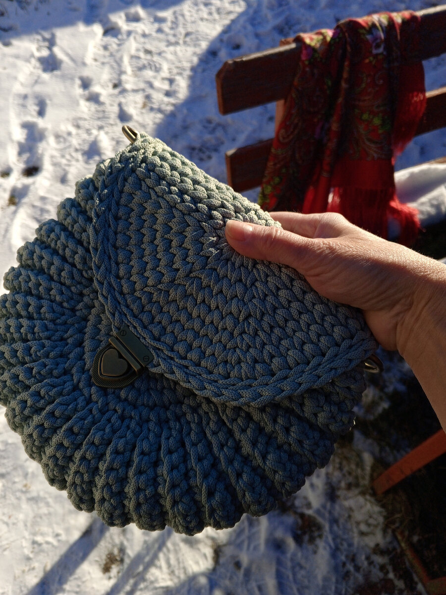 Сумочку сделала на заказ, размеры 26 на 23 см, чтобы вмешались: телефон, очечник, кошелек, ключи и всякие разные мелочи… Для изготовления использовала полиэфирный шнур диаметром 5 мм. Очень удобный материал и рукам приятно и понадобился всего один моток (200 м). Крючок № 7. Цвет выбрали - «оливка». Сначала я выбирала форму сумки, это было желание заказчика, она показала мне фото сумки, и я начала работать))) Пробовала разные узоры, но они не подходили к такой модели и вот я нашла вот такой вариант (см. фото) Начала вязать сумочку из середины, связала два небольших элемента в форме круга. Затем соединила их цепочкой из воздушных петель и стала вязать от одного края цепочки к другому, наращивая «тело» самой сумочки и захватывая круги. В общем распускала два раза – то кружочки большие, то цепочка короткая))) Ура! Нашла золотую середину. Теперь в сумочке помещаются все ее нужные предметы! Оформила сумочку аксессуарами – это железная длинная ручка-цепочка и застежка. Подкладку не делала… За