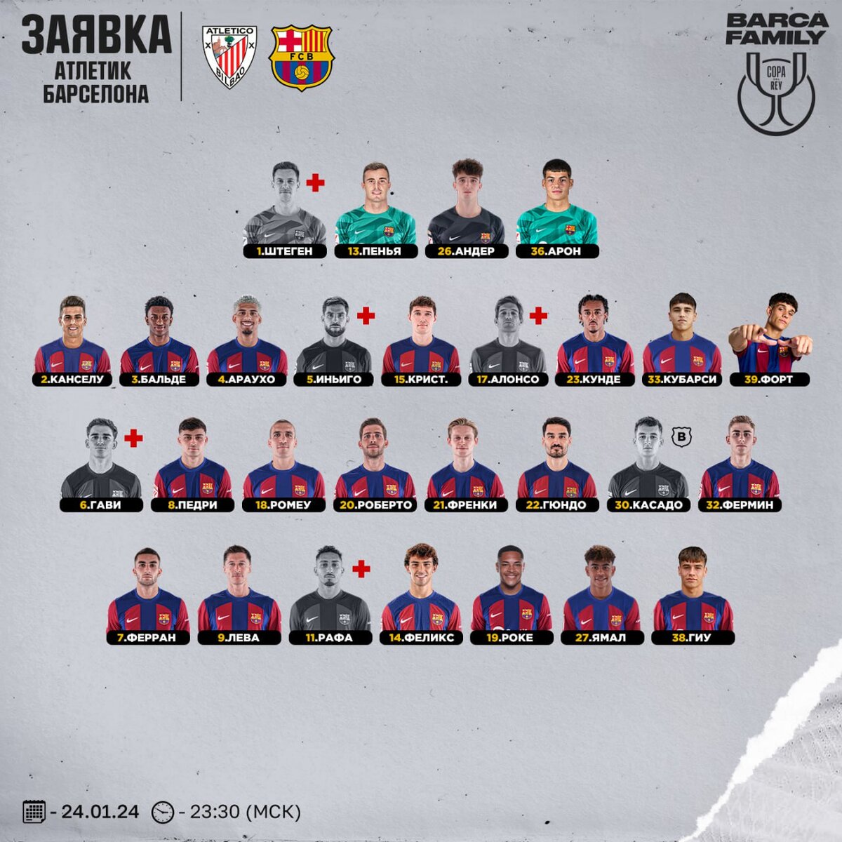 Но играть планируют с тройкой в защите Кристенсен и Канселу попали в заявку на матч, но по словам Хави они не готовы к выходу в старте: «Они в порядке. Я не думаю, что они выйдут в старте, но они могут получить минуты. Жоау почти не испытывает дискомфорта. У Андреаса был дискомфорт, но сейчас он в порядке». Иньиго Мартинес, Маркос Алонсо, Гави и Рафинья все еще травмированы. 1. Оборона Слова Хави немного смутили. Против мощного прессинга «Атлетика» куда логичнее использовать тройку центральных защитников, но Кристенсен не готов выходить в старте. Стоит ли довериться Кубарси в таких условиях? Слишком рискованно, ведь «Атлетик» одна из лучших команд Испании в плане прессинга. А из других вариантов только Роберто на фланге. 2. Полузащита Трио полузащиты остается неизменным, но к ним регулярно будет опускаться Ферран Торрес, чтобы создавать численное большинство. Из альтернативы – выход Фермина Лопеса четвертым в средней линии с оттяжкой на фланг. 3. Атака Жоау Феликс наконец-то должен пол