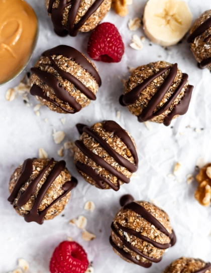 Вкусные и легкие энергетические закуски, которые по вкусу напоминают кусочек вашего любимого бананового кекса! Эти мини-десертики не требуют выпечки, они сделаны из банана, арахисовой пасты, полезных для сердца грецких орехов, овсяных хлопьев, семян чиа, протеинового порошка (по желанию) и небольшого количества шоколада. Это веганский продукт без глютена, идеальный перекус или завтрак на ходу! Эти банановые энергетические шарики богаты омега-3 благодаря грецким орехам и семенам чиа. Омега-3 - замечательная жирная кислота, необходимая для вашего мозга, сердца и иммунной системы. Многие люди изо всех сил пытаются получить достаточное количество омега-3 в своем рационе, поскольку мы, как правило, не едим достаточно рыбы, грецких орехов или овощей, содержащих этот тип питательных веществ. Еще одна причина полюбить эти пп пирожные - они богаты белком благодаря арахисовой пасте (или вашей любимой ореховой пасте) и протеиновому порошку. Хотя протеиновый порошок совершенно необязателен, я пре